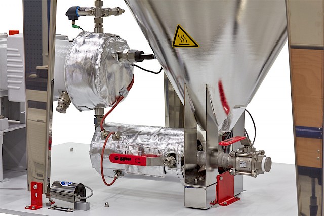 Das alternative System elektrische Heizung sorgt über isolierte, entfernbare Heizmanschetten für maßgeschneiderte Wärme ohne Totzonen. Da bei dieser Heizlösung jedes Bauteil eine eigene Heizung besitzt, kann die Temperatur bei Bedarf unterschiedlich eingestellt werden – die Leitungen können beispielsweise stärker beheizt werden als die Dosiereinheit. Elektrische Beheizung ist nicht die optimale Lösung für ATEX-konforme Geräte, da die hier notwendige Absicherung der Heizung vor Überhitzung aufwändig und kostenintensiv ist. In nicht explosionsgefährdeten Bereichen kann sie jedoch sogar problemlos mit einem doppelwandigen Heizsystem kombiniert werden. Individuell und anwendungsspezifisch – so, dass bei dieser Flüssigkeit und dieser Produktion alles fließt.